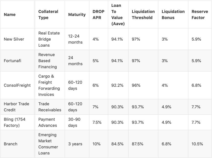 All Tinlake pools have existing risk parameters, most importantly the DROP APR. This is the interest rate that senior (DROP) investors receive on their capital (excluding any cash drag). This parameter reflects the risk of the underlying asset and the senior tranche investment. We propose to use the DROP APR as one of the main drivers to determine the Aave risk parameters while taking maturity, the asset class, the size of the pool and the diversification within the pool into consideration.