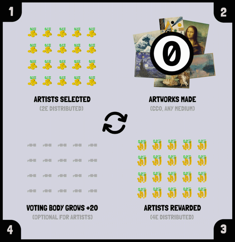 - Selected Artists vote on artists in upcoming rounds creating a perpetual, sybil resistant voting block: For Artists, by Artists.