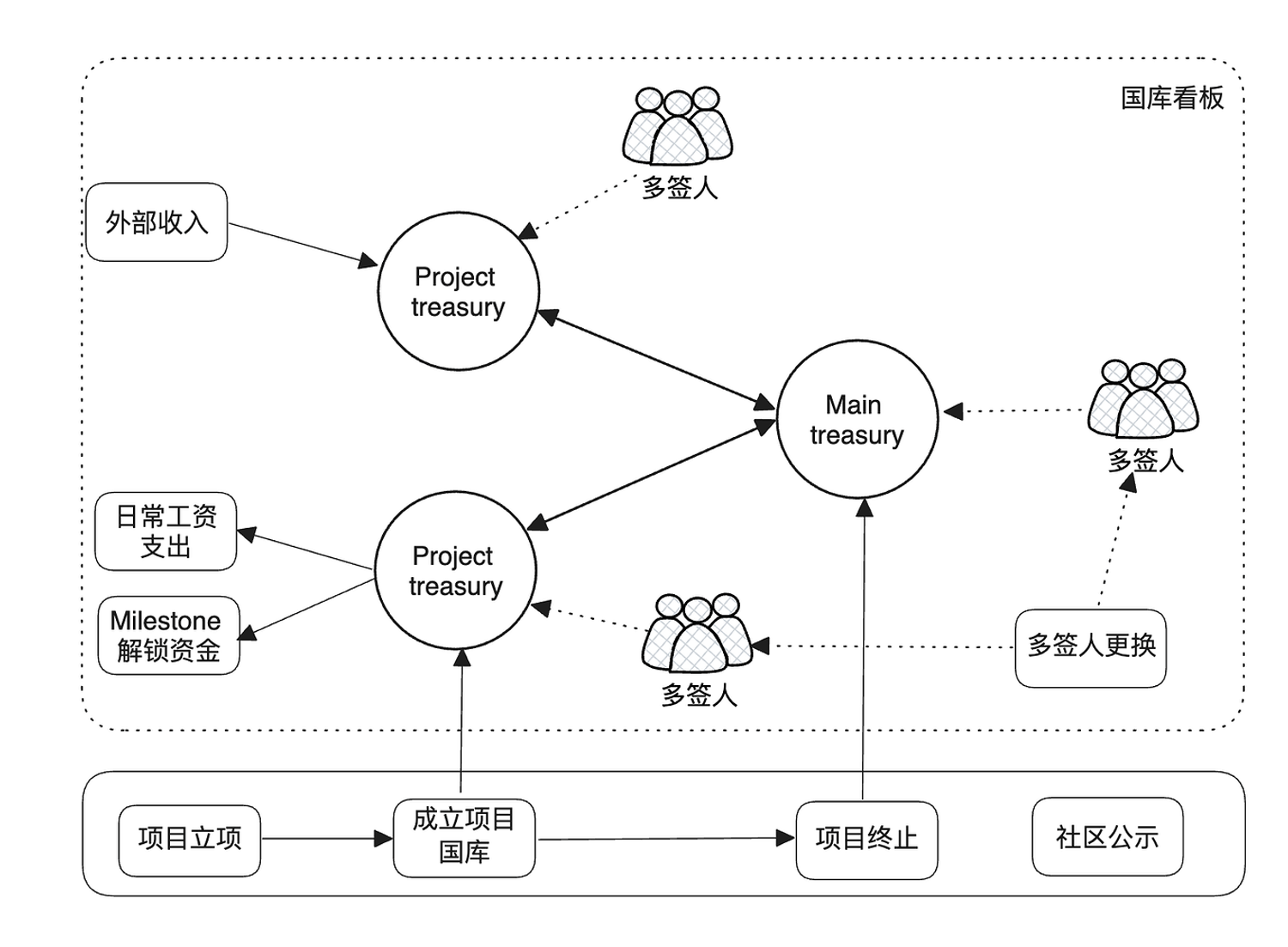 - Project Treasury Destruction Process: When a project terminates, all funds in the sub-treasury must be transferred back to the main treasury, and the project treasury is archived. For working group sub-treasuries, remaining funds are transferred back to the main treasury at the end of the season, with the sub-treasury retained.