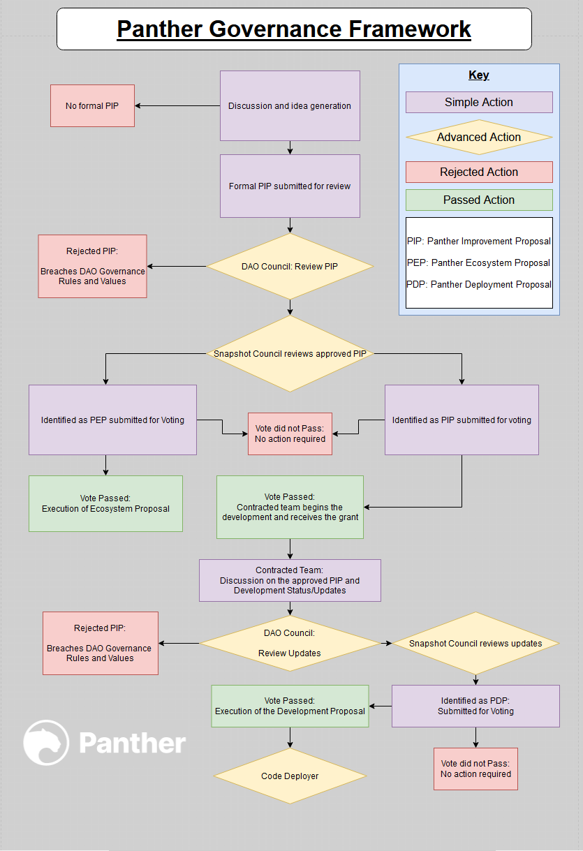 During the last few months, the Panther community has discussed the Panther Protocol Governance Framework in order to define workflows and realize a diagrammatic representation of Panther’s Governance process. Because of these efforts, a set of rules and guidelines are now defined and proposed as can be seen on the Panther Governance Framework flow diagram.